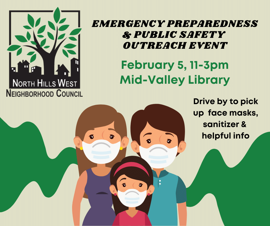 From 11am until 3pm, North Hills West Neighborhood Council Committee members were on hand at the Mid Valley Regional Library distributing free PPE, Personal Protection Equipment and providing information on how to get involved in our community.