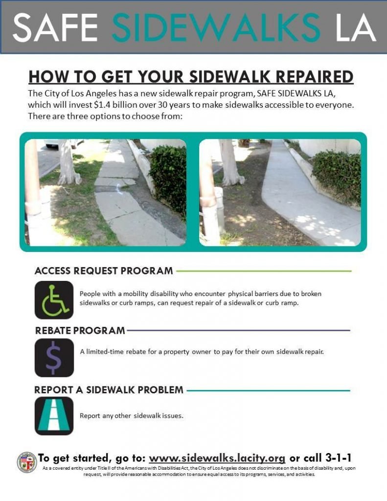 The City of Los Angeles has made a historic commitment to invest $1.4 billion over 30 years to fix sidewalks around the city and make them accessible to everyone. People with a mobility disability, or someone reporting on their behalf, who encounter physical barriers such as broken sidewalks, missing/broken curb ramps or other barriers in the public right of way can request sidewalk repairs through the Access Request Program. Through a cost-sharing initiative, the City is also offering a limited-time rebate program available to any property owner willing to pay for their own sidewalk repair.